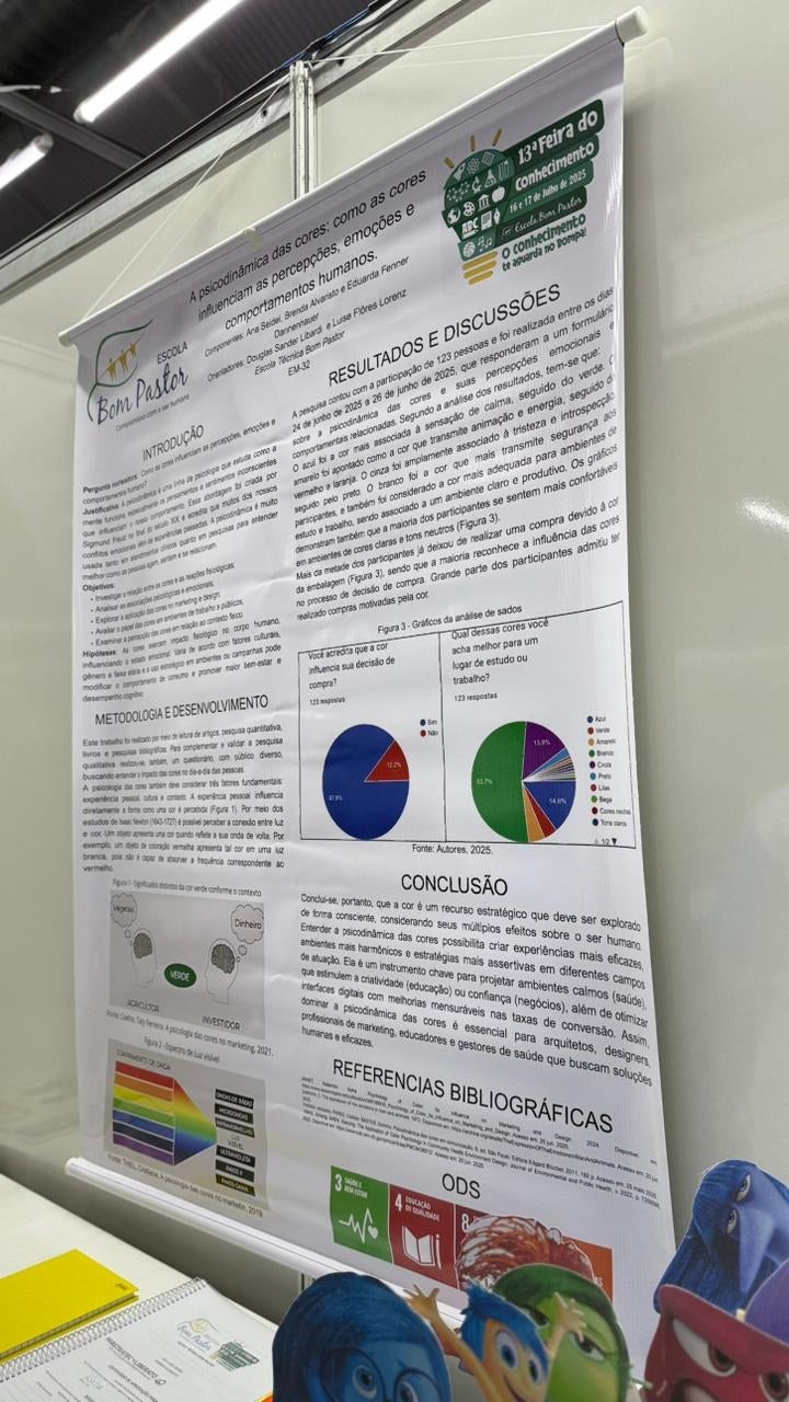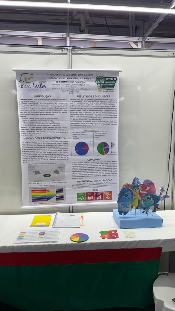 As talentosas alunas Ana Luiza Seidel, Brenda Alvaristo e Eduarda Fenner Dannenhauer, do Ensino Médio da Escola Técnica Bom Pastor, apresentam seu projeto intitulado Psicodinâmica das Cores: Como as Cores Influenciam as Percepções, Emoções e Comporta