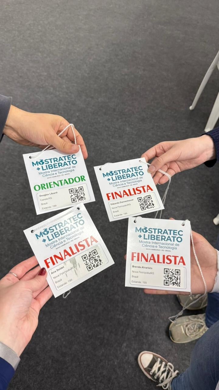 As talentosas alunas Ana Luiza Seidel, Brenda Alvaristo e Eduarda Fenner Dannenhauer, do Ensino Médio da Escola Técnica Bom Pastor, apresentam seu projeto intitulado Psicodinâmica das Cores: Como as Cores Influenciam as Percepções, Emoções e Comportamentos Humanos"na Mostratec-Liberato.