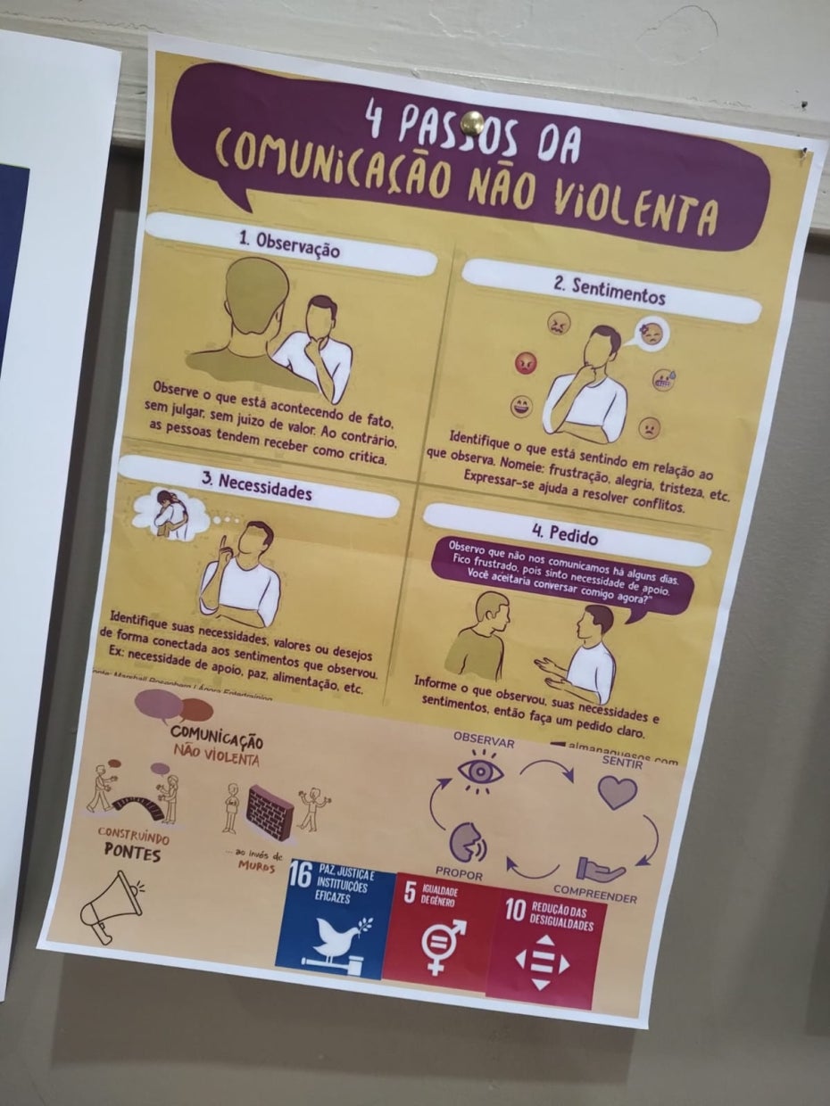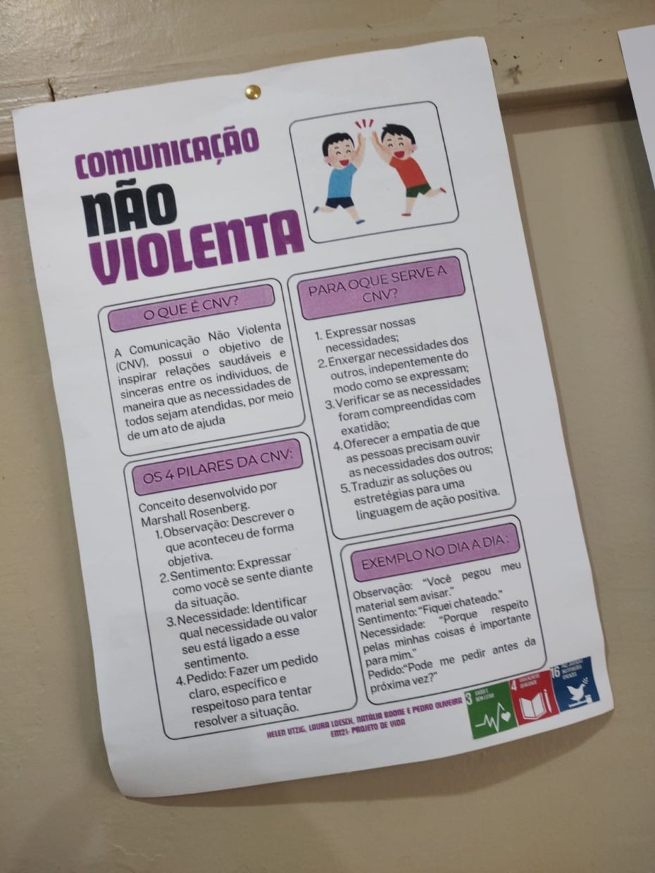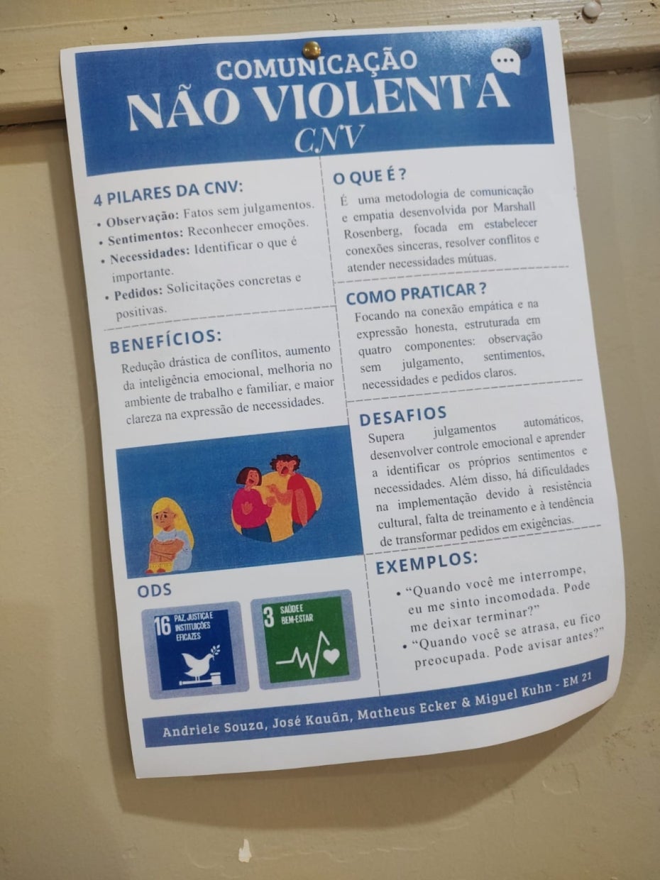 Mais do que um tema abordado em sala de aula, a Comunicação Não Violenta é trabalhada como uma prática contínua, incentivando o diálogo respeitoso, a escuta ativa e a resolução pacífica de conflitos. A metodologia se baseia em quatro pilares fundamentais: observação, sentimento, necessidade e pedido, promovendo maior consciência emocional e responsabilidade nas interações.