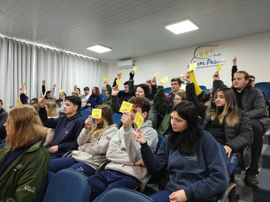 A Cooperativa Escolar Bom Pastor (COOEBOMPA) realizou, no dia 29 de agosto, no auditório da escola, uma Assembleia Extraordinária para efetuar a troca de membros das comissões Administrativa e Fiscal da cooperativa. Na oportunidade, os associados da COOEBOMPA elegeram, por meio do voto, a estudante do 2º ano do Ensino Médio, Isabeli Tomazini Madeira, como nova presidente da cooperativa. Vitória Alana Noer, estudante do 1º ano do Ensino Médio, foi eleita vice-presidente da COOEBOMPA e Brayan Eduardo Haubert, também estudante do 1º ano do Ensino Médio, foi eleito Conselheiro Fiscal titular da cooperativa escolar. A assembleia, organizada sob a supervisão do professor orientador, Fabiano Hanel dos Santos e do coorientador, Darlei Roier, contou com as presenças do diretor geral da Escola Bom Pastor, Adriano Fiorini e da supervisora do Ensino Médio, Rejane de Castro.