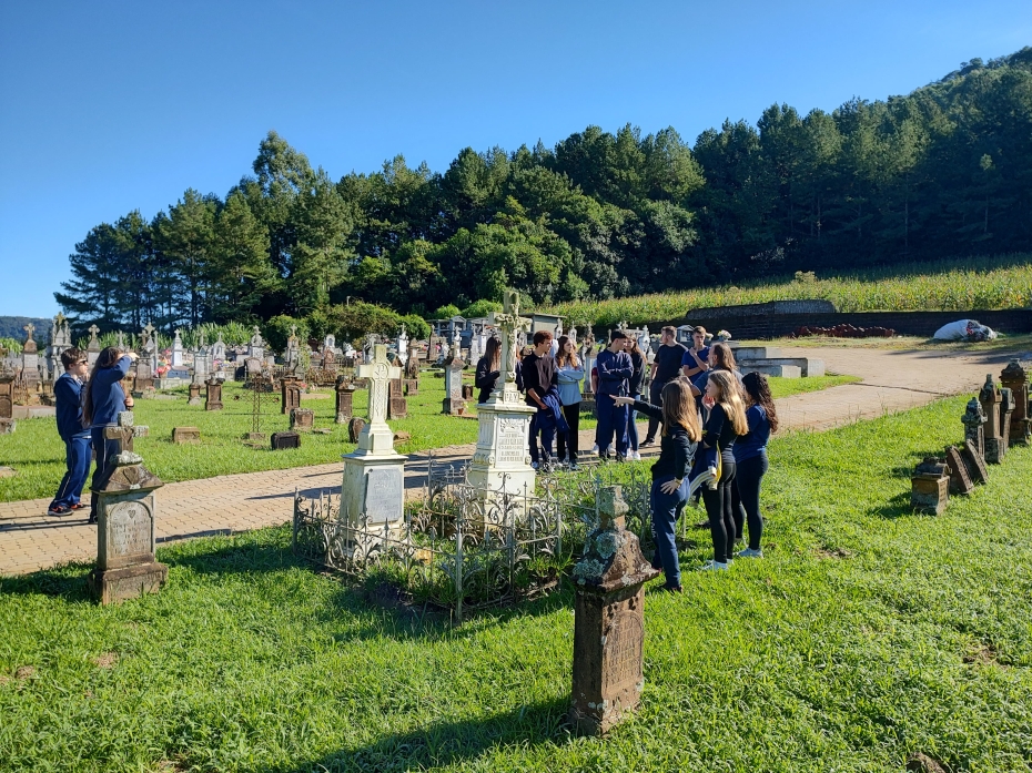 A disciplina Solidariedade e Movimentos Sociais proporciona uma experiência diferente para os estudantes do Ensino Médio da Escola Técnica Bom Pastor: conhecer o Cemitério Ecumênico Bom Pastor de uma maneira diferenciada, analisando e avaliando os aspectos patrimoniais e socioculturais do local. O professor do componente curricular, Sílvio Peters, adaptou a temática “Educação Patrimonial e os Movimentos de Preservação/Conservação Cultural”, para evidenciar características como arte, arquitetura e história existentes nos cemitérios. Essas particularidades do cemitério Ecumênico Bom Pastor, localizado em Linha Brasil, foram observadas e discutidas por uma turma de 3º ano do Ensino Médio do Bompa, na visita que realizaram ao local, no dia 19 de abril.